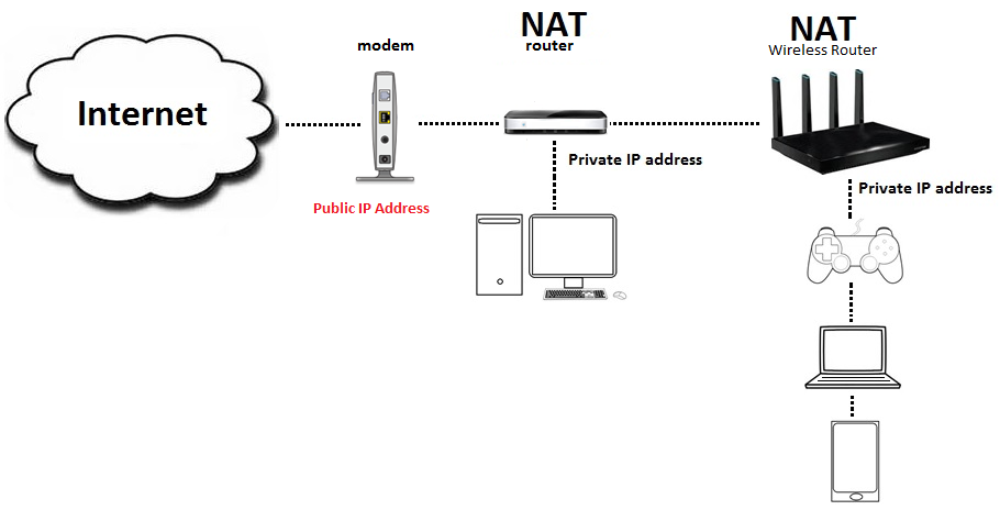 There are 4 billion IP addresses are available in IPv4 (32 bits) network. If each person connect to the internet using individual IP address, the current IP addresses in IPv4 (4,294,967,296) is not enough. Network Address Translation (NAT) concept was introduced to solved this IP address issue. The router get only one public IP address from ISP and all other connected devices gets the private IP address, it usually start with 192.168.0 or 10.0.0. NAT converts all private IP address request and send outside the world using one public IP address. With this, a home or an organization needs only one public address to connect the internet. Router are distributing private IP addresses using DHCP function.