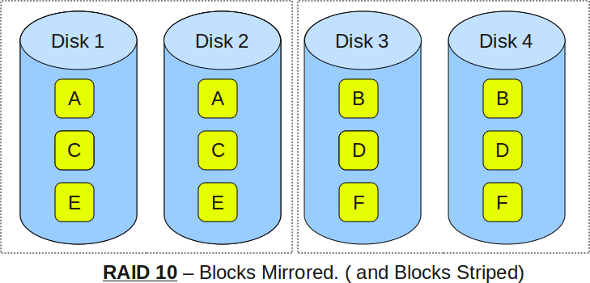 RAID 10 also known as RAID 1+0. It combined disk mirroring and disk stripping to protect the data. If one disk in each mirrored pair is functional, data can be retrieved.