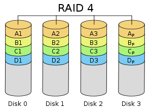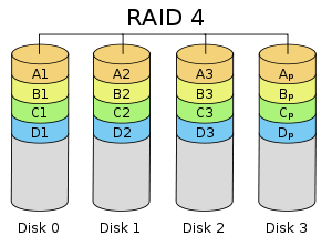 RAID 4 stripes data at the block level with a dedicated parity disk. RAID 4 provides superior performance of random reads, while the performance of random writes is low due to the need to write all parity data to a single disk.