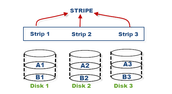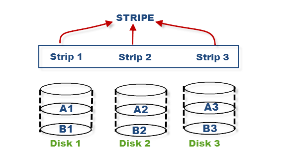 In Stripping, hard disk divided into blocks and these blocks are stacked together and called strips. With multiple hard disks placed parallel or serial, we can achieve the stripe. Without mirroring and parity, Stripping cannot have safe data but stripping may significantly improve the I/O performance.